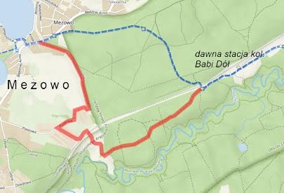 możliwego miejsca na przekroczenie torów, którym jest pozostawiony wiadukt położony ponad kilometr dalej na południowym skraju Mezowa i pójście odcinkiem obejściowym. To jest lasem na zachód potem, przy kilku daczach, esowatym łukiem w