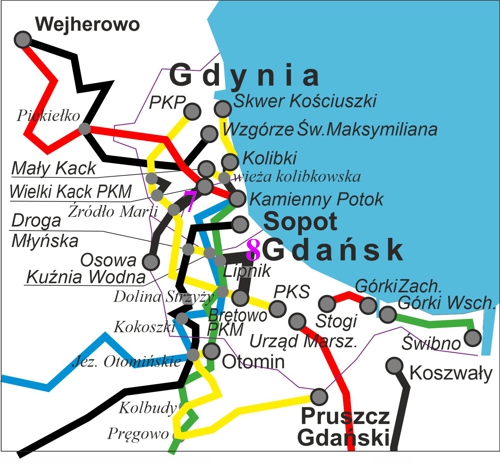 - szlak czarny Źródła Marii doprowadzony przez Wielki Kack do przystanku PKM Wielki Kack i szlaku Wejherowskiego [7]